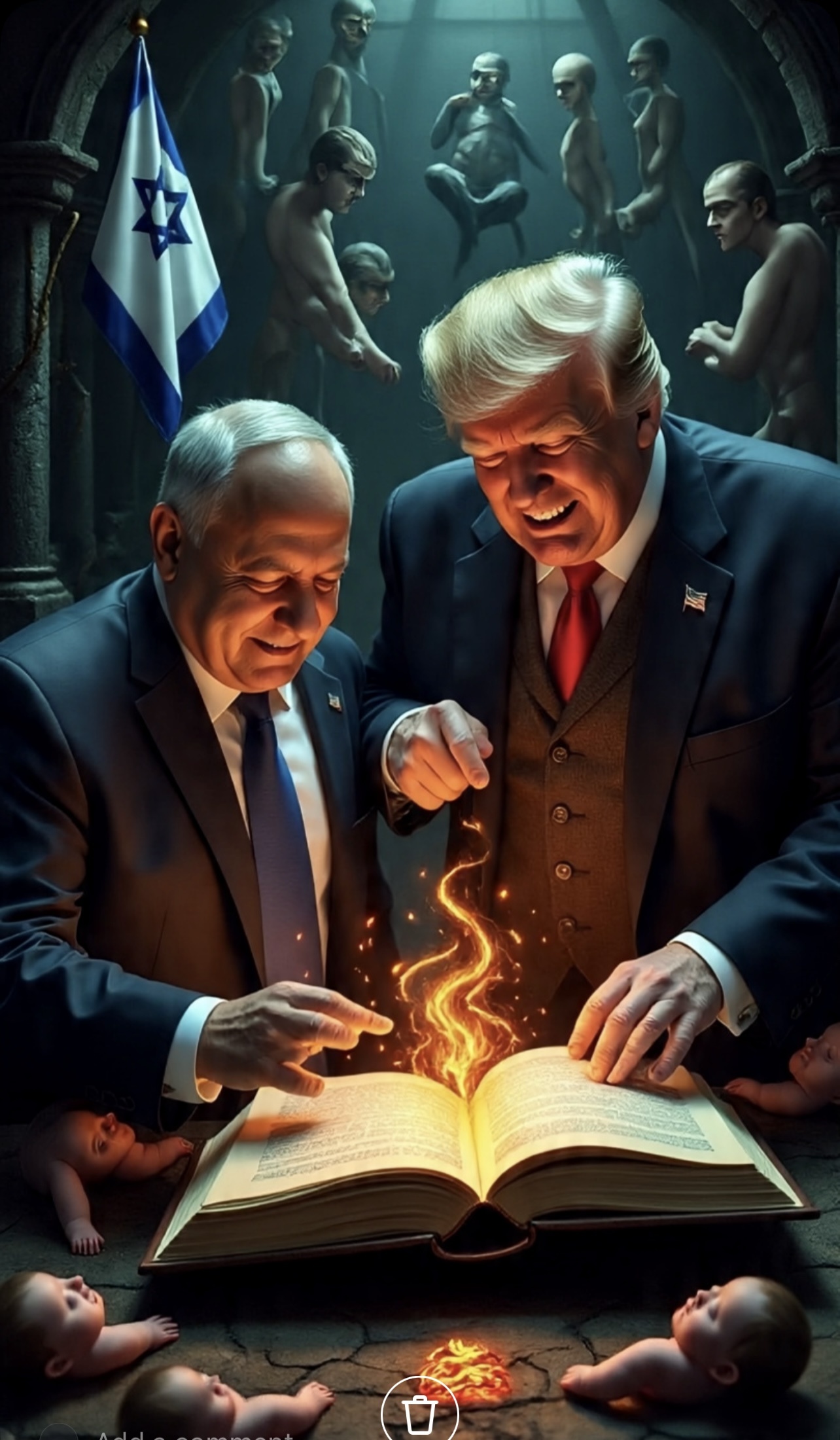 Little something I made with IG AI. It refuses to actually depict Netanyahu for some reason. Just makes a guy similar 🤔